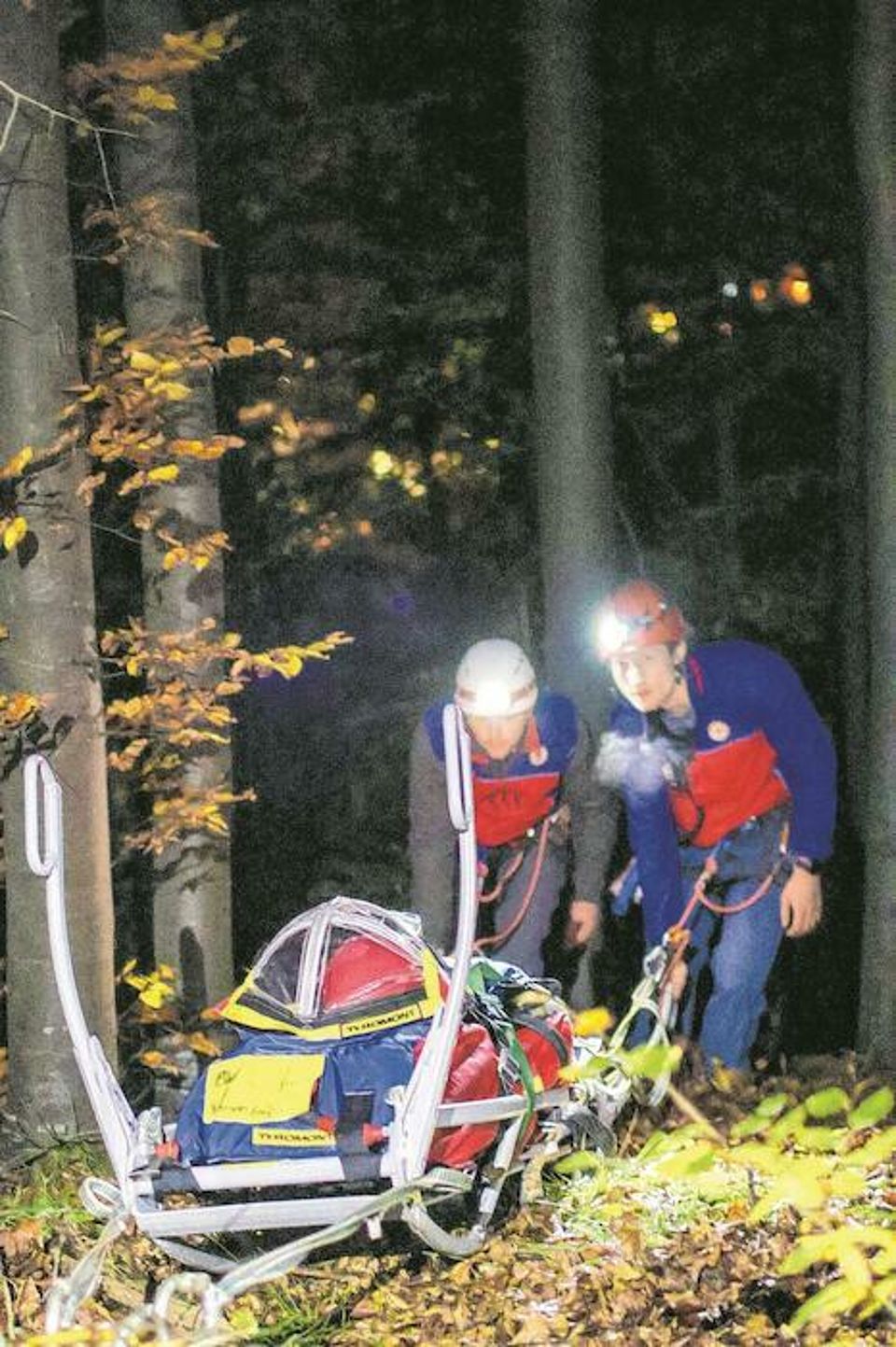 Nach kurzer Zeit konnten die Patienten durch die Voraustrupps aufgefunden werden. Der Junge wurde im Gelände notfallmedizinisch versorgt und anschließend mit der Gebirgstrage unter Seilsicherung abtransportiert. Die unverletzte Schwester wurde in absturzgefährdetem Gelände entdeckt. Bergretter seilten sich gemeinsam mit ihr zum nächsten sicheren Forstweg ab.