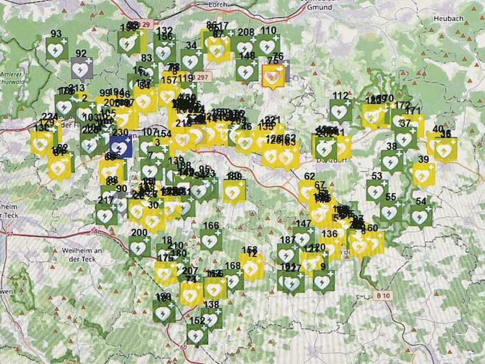 Kreis Göppingen - Ein kurzer Klick und der gesamte Landkreis füllt den Bildschirm aus. In der Karte sind zahlreiche Punkte eingezeichnet, die Peter Welsch und seine Mitarbeiter von der Integrierten Leitstelle (ILS) anklicken können, um weitere Informationen zu erhalten. Die interaktiven Markierungen stellen Defibrillatoren dar, die für den gesamten Landkreis in einer Karte markiert sind. Wo genau an oder in einem Gebäude befindet sich der Defibrillator? Zu welchen Zeiten ist er zugänglich? Hinterlegt sind in der „DEFI-Map“ aber auch Fotos. „So kann der Mitarbeiter demjenigen, der den Notruf abgesetzt hat, genaue Anweisungen geben. Aber nur, wenn geklärt ist, dass es sich um einen Herz-Kreislaufstillstand handelt und auch nur dann, wenn genügend Helfer am Notfallort sind. Ansonsten hat die Reanimation bei Herz-Kreislaufversagen absolute Priorität.“ Das bedeute „drücken, drücken, drücken!“