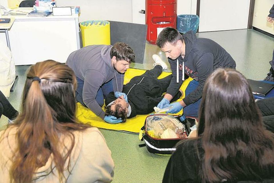 Kurze Pause, dann folgt die Praxis-Ausbildung. Basis für die DRK-Schulsanitäter-Ausbildung ist ein ganz normaler Erste-Hilfe-Kurs, sagt Sebastian Grothe. Er ist Ausbilder beim DRK und auch Lehrer für Deutsch, Geschichte und Gemeinschaftskunde an der Kaufmännischen Schule. Er leitet die Schulsanitäter-Ausbildung in Geislingen, die DRK-Rettungssanitäterin Emelie Grothe vorn am Pult ist seine Schwester. Nach der Ausbildung stoßen die ausgebildeten und geprüften Sanitäter zum Schulsanitätsdienst-Team. Denn alle Auszubildenden sind auch Schüler der Kaufmännischen Schule, sie helfen dann im Notfall ihren Mitschülern und Lehrern.