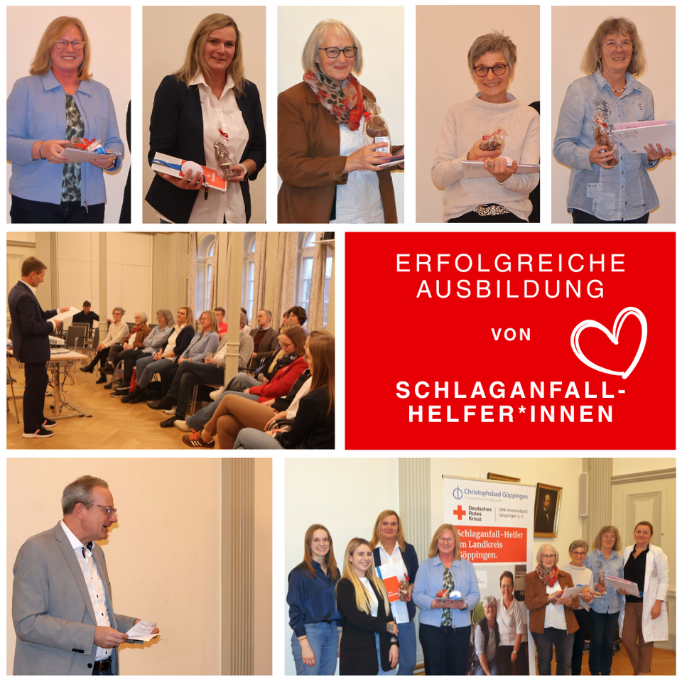 „Es geht um Verständnis für Einschränkungen“, sagt Birgit Mangold. „Menschen helfen, wieder ein bisschen normalen Alltag leben zu können“, dazu möchte Claudia Widmayer beitragen. Die beiden Frauen haben mit sieben weiteren Ehrenamtlichen in den vergangenen Monaten eine fachlich hochwertige Ausbildung zur Schlaganfallhelferin absolviert und erhielten jetzt im Klinikum Christophsbad aus den Händen von Chefärztin PD Dr. Katharina Althaus und Svenja Wörz, beim DRK-Kreisverband Göppingen Leiterin der Abteilung Sozialarbeit, sowie Frederike Prisett von der Stiftung Deutsche Schlaganfall-Hilfe ihre Zertifikate überreicht. Sie sind ab sofort Ansprechpartner*innen für Betroffene und ihre Angehörige, wenn nach der Diagnose Schlaganfall plötzlich Vieles oder gar Alles nicht mehr ist wie vorher, wenn ein Alltag mit gravierenden Veränderungen gelebt werden muss. Es sind etwa eintausend Schlaganfallpatient*innen, die jedes Jahr im Christophsbad behandelt werden. Wenn sie entsprechend stabilisiert aus der Klinik oder der Reha entlassen werden, sind gleichwohl unter Umständen viele Fragen zu klären. „Die Menschen brauchen mehr als nur eine medizinische Versorgung. Nicht alles aber kann das Versorgungssystem leisten“, stellte Rudolf Schnauhuber, der Geschäftsführer der Klinik anlässlich einer kleinen Feierstunde im Herrensaal fest. Er zeigte sich „begeistert, wie schnell wir Alles gemeinsam umsetzen konnten“. Ein Ausbildungskonzept der Stiftung sei von den Klinikmitarbeitenden und dem DRK-Kreisverband „für unsere Arbeit weiterentwickelt worden“. In der Qualifizierung der Ehrenamtlichen seien sehr viele Aspekte bis hin zu rechtlichen Fragen“ thematisiert worden. Rudolf Schnauhuber dankte den Ehrenamtlichen, „dass Sie bereit sind, Verantwortung zu übernehmen“. Und: „Ihre Aufgabe wird anspruchsvoll sein.“