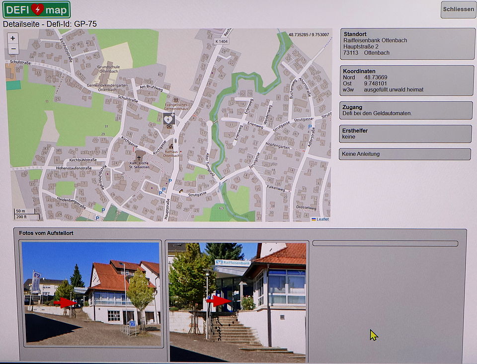 Ein kurzer Klick und der gesamte Landkreis füllt den Bildschirm aus. In der Karte sind zahlreiche Punkte eingezeichnet, die Peter Welsch und seine Mitarbeitenden von der Integrierten Leitstelle (ILS) anklicken können und dann weitere Informationen erhalten. Die interaktiven Markierungen stellen Defibrillatoren dar, die jetzt für den gesamten Landkreis in einer Karte markiert sind. Wo genau an oder in einem Gebäude befindet sich der Defibrillator? Zu welchen Zeiten ist er zugänglich? Hinterlegt sind in der „DEFI-Map“ aber auch Fotos. „So kann der Mitarbeitende demjenigen, der den Notruf abgesetzt hat, genaue Anweisungen geben. Aber nur, wenn geklärt ist, dass es sich um einen Herz-Kreislaufstillstand handelt und auch nur dann, „wenn genügend Helfende am Notfallort sind. Ansonsten hat die Reanimation bei Herz-Kreislaufversagen absolute Priorität.“ Das bedeute „drücken, drücken, drücken!“