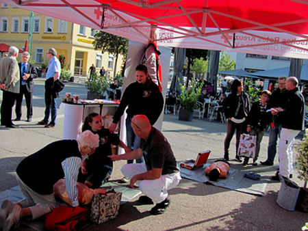 Viel positive Resonanz gab es am 24. September auf dem Göppinger Marktplatz - Im Rahmen der bundesweiten Aktion “Woche der Reanimation” konnten sich interessierte Passanten informieren und die Reanimation an den Puppen üben.