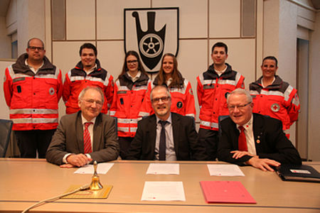 Festes Fundament für die Helfer vor Ort - Mitte März unterschrieben der Amstetter Bürgermeister Jochen Grothe, der Präsident des DRK Kreisverbandes Göppingen, Peter Hofelich sowie der Stellvertretende Präsident des Kreisverbandes Ulm, Bruno Schmid eine Kooperationsvereinbarung für die „Helfer vor Ort“ in Amstetten.