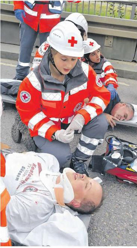 Vorführung Beim Herbstfest des Geislinger Tierschutzvereins stellte sich jüngst das Jugendrotkreuz vor. Am Beispiel eines fiktiven Arbeitsunfalls mit drei Verletzten wurden unter anderem die stabile Seitenlage, die Schocklage und das Verbinden stark blutender Wunden gezeigt und erklärt.
