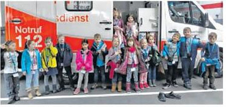 Bad Boll - Einen Blick hinter die Kulissen des DRK Göppingen durfen die Kinder aus Bad Boll werfen. „Schlappen“ stehen in der Fahrzeughalle herum. Warum fragen sich die Vorschulkinder vom Kindergarten am Riedbächle aus Bad Boll. Viele Einsatzfahrzeuge sind bereits unterwegs, als Frau Stamos uns einen Blick in die beiden Fahrzeughallen des DRK Göppingen gibt. Schutzschuhe stehen vor dem Notarztwagen und die Einsatzjacke hängt an der offenen Tür bereit für den nächsten Einsatz.